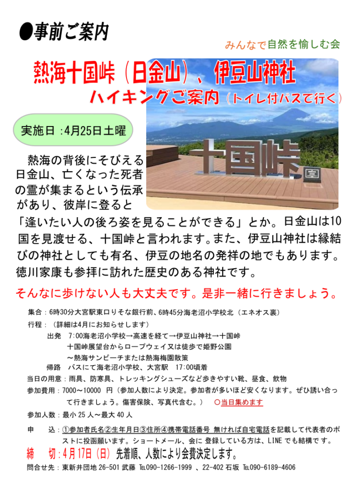 予定していた2月8日の長瀞宝登山は降雪の為中止致しました。昨年の茶臼岳も天候に恵まれませんでしたが今回も残念です。4月25日には熱海十国峠の計画をしています。ふるってご参加ください。 下記十国峠ハイキングの集合場所は大宮駅東口りそな銀行前。6時30分にはバスは出発し海老沼小学校に向かいます。大宮駅に集合の方は遅れないようにお願いします。